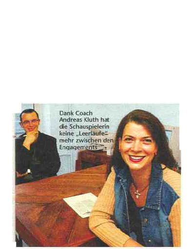 Es fanden mehrere "Sitzungen" statt (Kosten: 80 Euro/Stunde). ,,Zunächst hat Herr Kluth meine Bewerbungsunterlagen für die Schauspielerei gecheckt", so die Künstlerin. "Er wollte wissen, ob ich mich auch richtig vermarkte. Das war aber alles in Ordnung. Danach haben wir gemeinsam versucht, eine sinnvolle Strategie gegen meine Durchhänger' zu entwickeln. Und noch während wir redeten, erwachten in mir ganz neue Impulse. Mir wurde klar. Ich wollte anfangen zu schreiben."